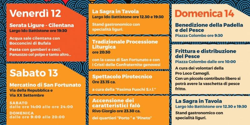 La sera della vigilia, si terrà la consueta celebrazione religiosa, con la processione religiosa dell'Arca di San Fortunato accompagnata dalla Banda “Città di Camogli”; successivamente, sulla spiaggia, si potrà ammirare lo stupefacente spettacolo dell'incendio dei falò, mentre i fuochi d’artificio sul mare regaleranno ai visitatori momenti davvero suggestivi.