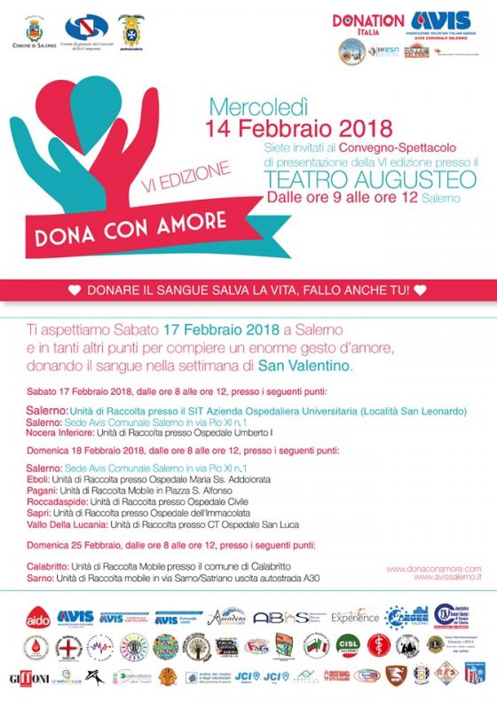 L’evento, di cui in oggetto, è una giornata nazionale destinata alla promozione e alla sensibilizzazione della donazione del sangue ed all’integrazione socio-culturale. DONA CON AMORE, giunta alla sua VI edizione, si svolgerà il giorno Sabato 17 Febbraio 2018 presso il reparto Immuno-Trasfusionale dell’Azienda Ospedaliera Universitaria San Giovanni di Dio Ruggì d'Aragona di Salerno dalle ore 08.00 alle ore 13.00 ed in tanti altri Centri Ospedalieri dislocati sulla provincia di Salerno nei giorni Sabato 17 e Domenica 18 febbraio 2018.