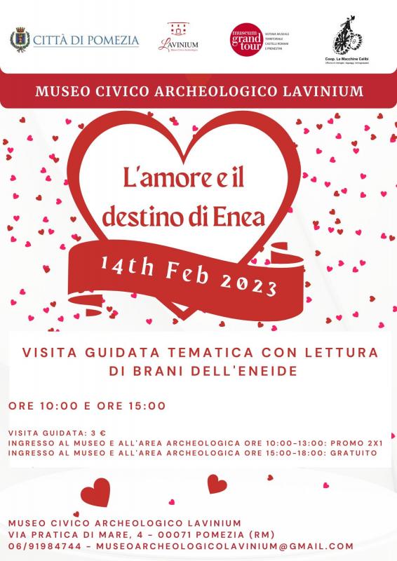 Martedì 14 febbraio, in occasione della festa di San Valentino, vi aspettiamo alle ore 10:00 e alle ore 15:00, per ripercorrere insieme i grandi amori e il destino del nostro pio Enea!