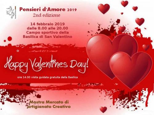In occasione della Festa di San Valentino, Patrono della città di Terni e Protettore degli Innamorati nel mondo, l’Associazione Eventi & Comunicazione, con il patrocinio del Comune di Terni organizza la Mostra Mercato Pensieri d’Amore, in programma il 14 febbraio 2019, presso il campo sportivo della Basilica di San Valentino a Terni, in prossimità della Fiera di San Valentino.