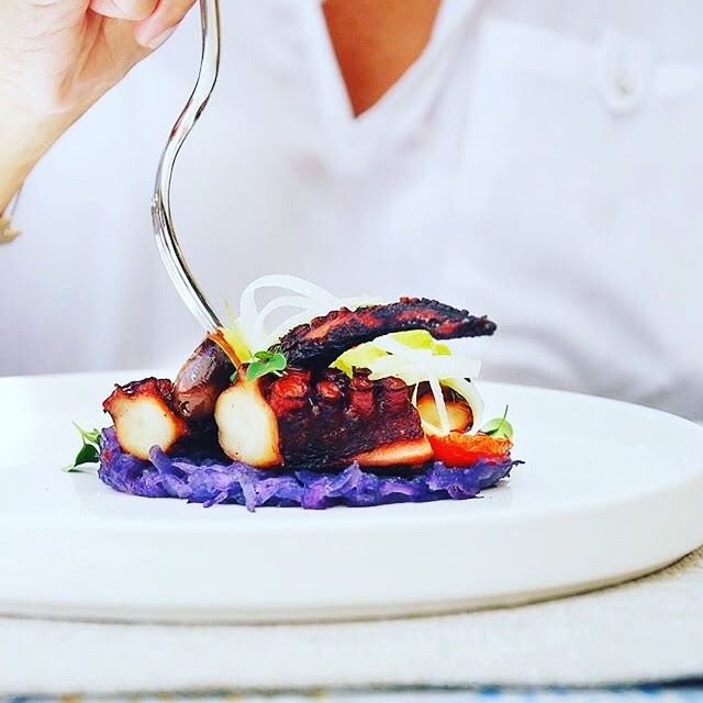 Polpo tre cotture, vellutata di ceci, passion fruit, pomodorini confit