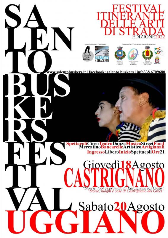 Sarà una vera e propria festa di ri-partenza per tutti coloro che puntualmente di anno in anno aspettano e in-seguono il POETICO MIGRAR della CAROVANA dei BUSKERS composta da musicisti di strada, saltimbanchi, guitti, equilibristi e giocolieri: sono loro i veri protagonisti di questo evento che porteranno nelle piazze ed i centri storici di Castrignano dei Greci e Uggiano la Chiesa, spettacoli di magia, di giocoleria, con i tessuti e trapezio aereo, con le bolle di sapone, con il fuoco, fantasisti, marionettisti, musicisti di strada, laboratori per bambini, trampolieri e mimi, faranno sognare grandi e piccini.