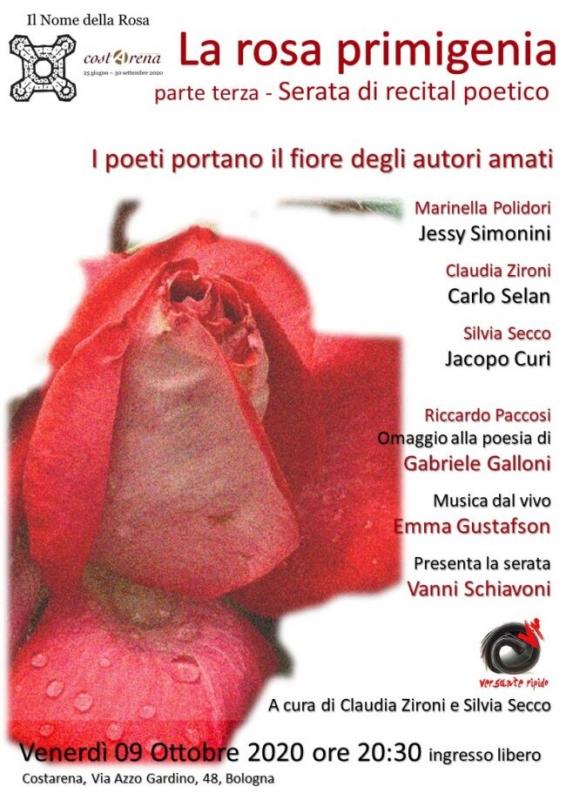 Nell’ambito del progetto culturale “IL NOME DELLA ROSA” del Centro Costa, capofila per varie associazioni del territorio, Versante ripido propone recital di poesia curati da Silvia Secco e Claudia Zironi dal titolo “LA ROSA PRIMIGENIA”: in alcuni incontri noti poeti ci portano la storia e i testi di loro padri ispiratori e loro poesie, in altri, poeti e poetesse di esperienza fungono da padrini e madrine di giovani voci.