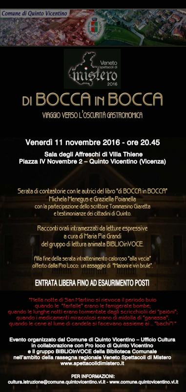 Venerdì 11 novembre 2016 alle ore 20.45 presso la Sala degli affreschi della palladiana Villa Thiene a Quinto Vicentino (Vicenza) si terrà una serata di contastorie con le autrici del libro “di BOCCA in BOCCA”