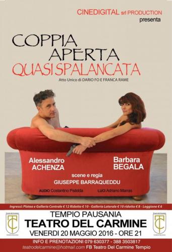 " Coppia Aperta quasi spalancata" , capolavoro di Dario Fò e Franca Rame scritto negli anni 80 , racconta la storia tragi-comica di una coppia e il tentativo di mettere in atto il concetto di " coppia aperta " da parte della moglie e i conseguenti tentativi del marito di non perdere la compagna di una vita. Una storia dal ritmo incessante con finale a sorpresa : la coppia aperta forse rimane una vera utopia.