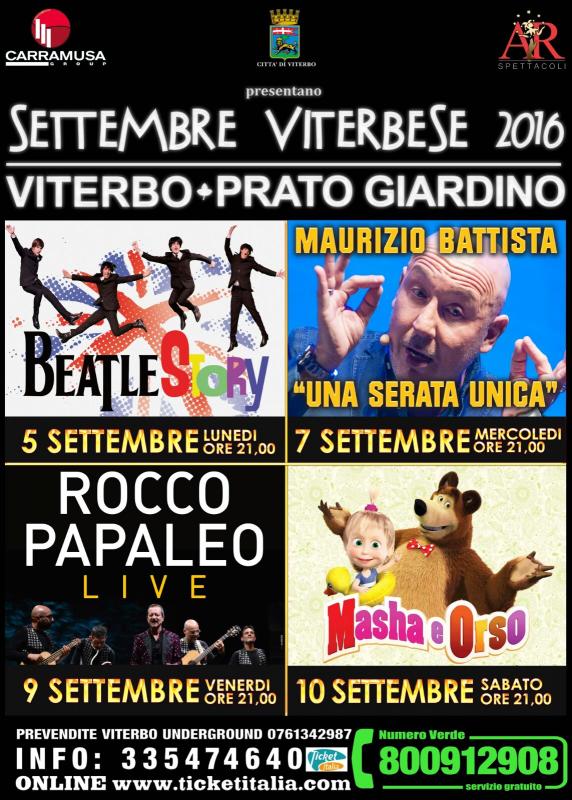 Si comincia con Beatles Story il 5 settembre per poi proseguire con l’umorismo irriverente di Maurizio Battista, il live di Rocco Papaleo e lo show dei personaggi più amati dai bambini, Masha e Orso.