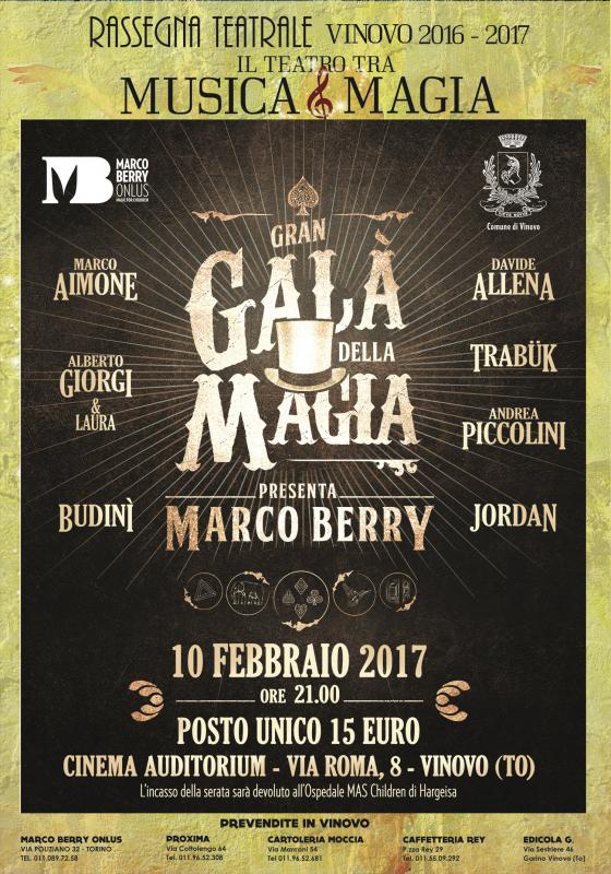 La Magia torna a Vinovo con un appuntamento esclusivo. Il 10 febbraio, alle ore 21.00 prenderà vita un’entusiasmante immersione nel misterioso mondo della magia, insieme ai migliori maghi italiani. Direttamente dal Circolo della Magia di Milano (il CLAM, diretto da Raul Cremona) Jordan e Andrea Piccolini insieme a Marco Aimone, Davide Allena, Alberto Giorgi & Laura, Trabuk, Budinì e, naturalmente, Marco Berry daranno vita ad uno spettacolo incredibile. Sul palco veri e propri miracoli per due ore di spettacolo che sorprenderanno ogni tipo di pubblico.