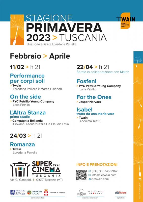 Al via alla Stagione 2023 di Twain Centro di Produzione Danza, con la direzione artistica di Loredana Parrella, che riparte dal Supercinema di Tuscania con quattro appuntamenti tra febbraio e aprile. Protagonisti di questa prima parte di stagione compagnie ed artisti affermati ed emergenti del panorama nazionale ed internazionale: Twain physical dance theatre, Petrillo Young Company, Giovanni Leonarduzzi e Lia Claudia Latini, Jasper Narvaez e Anonima Teatri.