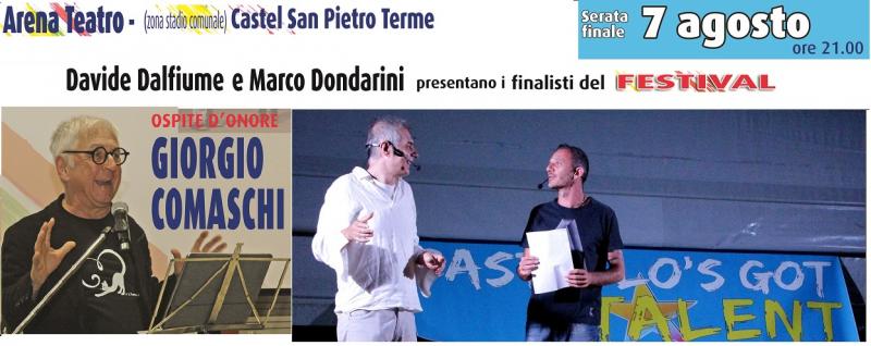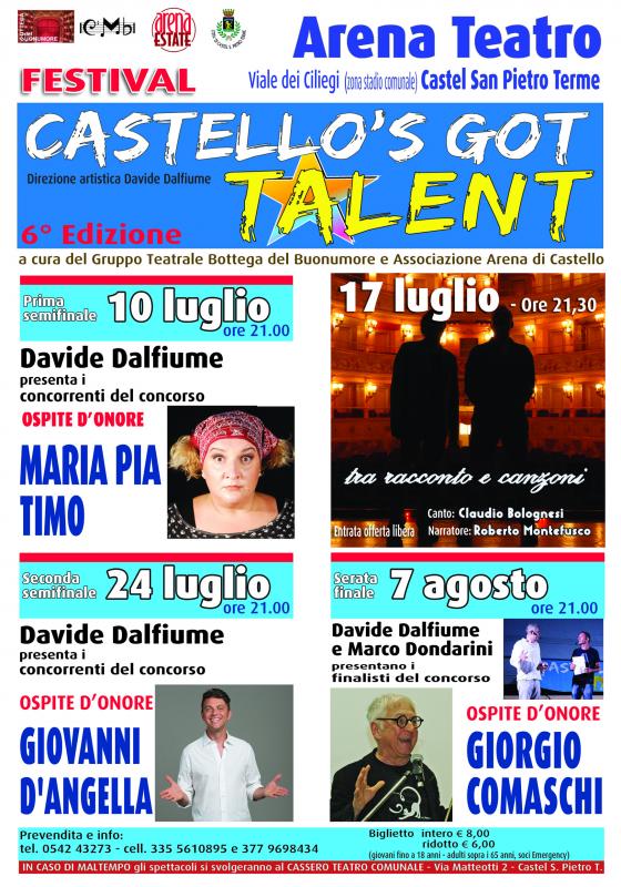 Gran finale martedì 7 agosto all’Arena Comunale di Viale dei Ciliegi a Castel San Pietro Terme del Festival "CASTELLO'S GOT TALENT" - a cura del Gruppo Teatrale Bottega del Buonumore e dell’Associazione Arena di Castello, per la direzione artistica di Davide Dalfiume.