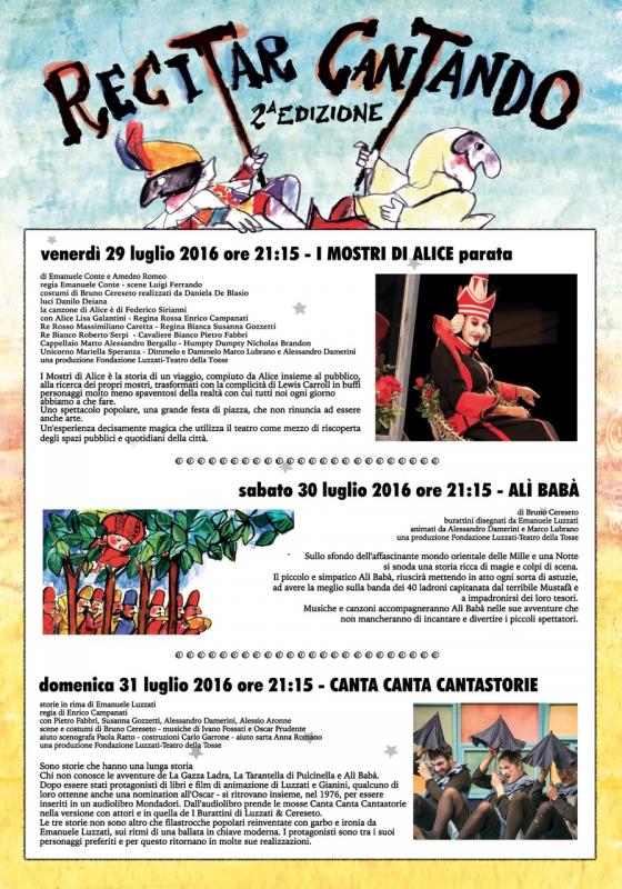 A luglio sono tre i titoli del Teatro della Tosse in programma nell’ambito della rassegna Recitar cantando a Santa Margherita Ligure: la parata di Alice il 29 , Alì Babà il 30 e infine Canta Canta Cantastorie il 31 luglio.