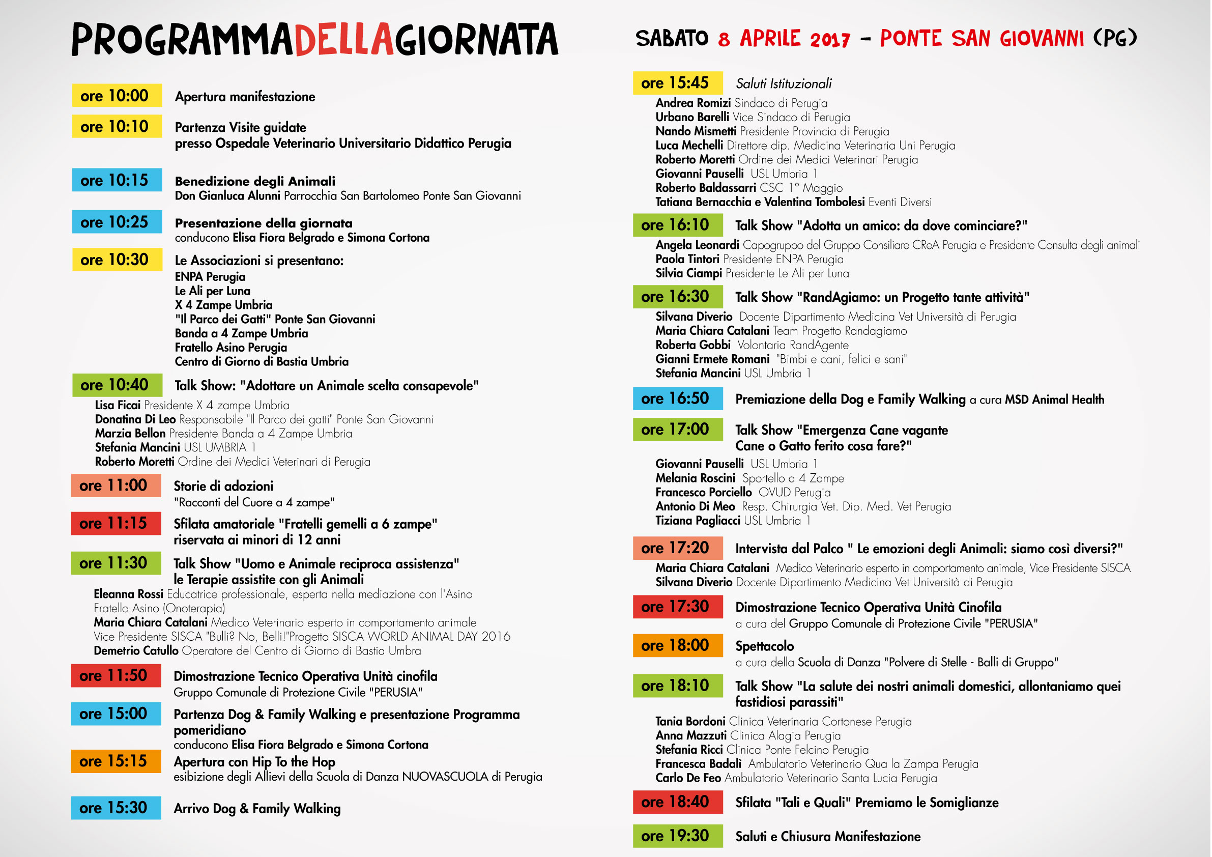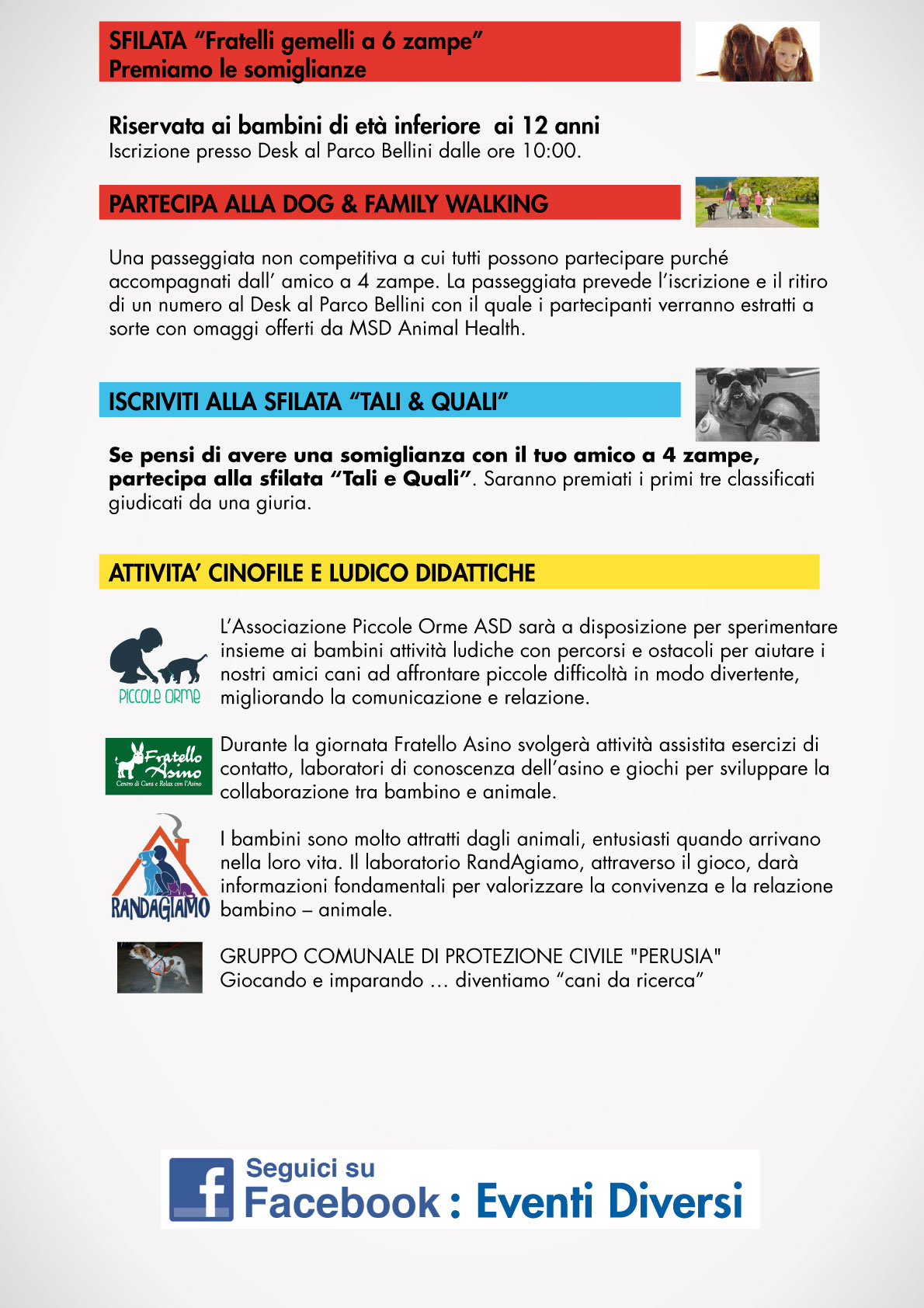 Dalle ore 10:00 una giornata per tutti, ci saranno i talk show con i medici veterinari, la Dog & Family Walking, una passeggiata non competitiva per dire #NoAbbandono, la sfilata amatoriale "Fratello Gemello a sei zampe" - riservata ai bambini fino ai 12 anni e "Tali e Quali" premiamo le somiglienze tra il padrone e l'animale.
