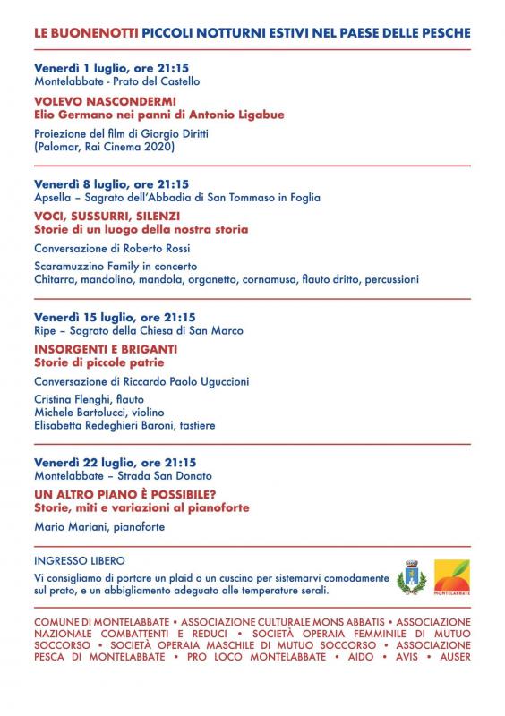 La rassegna, promossa dal Comune di Montelabbate, ha la direzione artistica dell’Associazione Culturale Mons Abbatis ed è realizzata con l’indispensabile collaborazione di tante realtà locali: Associazione Pesca di Montelabbate, Società Operaia Femminile, Società Operaia Maschile, Associazione Combattenti e Reduci, Pro Loco, Auser, Avis e Aido.