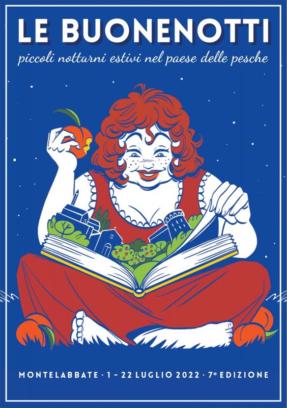 Il manifesto delle Buonenotti, firmato come sempre dall’illustratore montelabbatese Twenty_one Avenue (Riccardo Rossi), quest’anno ritrae la simpatica e prosperosa Nettarina rapita dalla bellezza del nostro paesaggio che sorge, come per incanto, dalle pagine di un libro.