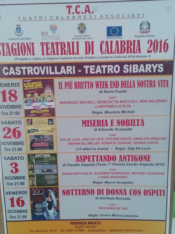S’inizia venerdì 18 novembre, alle ore 21, al Sybaris, con “Il più brutto week end della nostra vita” di Norm Foster con Maurizio Micheli che è anche regista, Benedicta Boccoli, Nini Salerno ed Antonella Elia, per passare, sabato 26 novembre, a “Miseria e Nobilità” di Eduardo Scarpetta con Gigi De Luca che è il regista, Gino De Luca, Stefano Ariota, Annalisa Arbolino, Marina Billiwiller, Roberta Capasso e Viviana Curcio (ed altri attori in scena), approdando, sabato 3 dicembre, allo spettacolo “Aspettando Antigone” –primo premio Cendic Segesta 2015- di Claudio Zappalà con Dario Battaglia, Vladimir Randazzo, Nicasio Catanese e Ivan Graziano, guidati dalla regia di Mauro Avogadro, per finire, venerdì 16 dicembre, a “Notturno di donna con ospiti” di Annibale Ruccello con Giuliana De Sio per la regia di Enrico Maria Lamanna.”