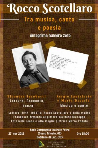 SATRIANO DI LUCANIA - Si terrà domenica 27 Novembre alle 18:00 nello Spazio di interazione teatrale della Compagnia Petra a Satriano di Lucania, in via Corso Trieste 63, l’anteprima e numero zero di uno spettacolo di musica, canto e poesia dedicato a Rocco Scotellaro. L’evento è organizzato dall’associazione musicale Akilina Simakova di Montemurro e dall’associazione Al Parco di Satriano di Lucania in collaborazione con la Compagnia Teatrale Petra. Sergio Santalucia, che ha composto le musiche originali sui testi di Scotellaro, suonerà zampogna, ciaramella, chitarra, mandolino, organetto, fisarmonica. Ad accompagnarlo ai suoni ci sarà Mario Decarlo che suonerà ciaramella, flicorno, clarino, violino, organetto, mandolino e tamburello. Elenora Iacobucci avrà il compito di leggere, raccontare e danzare. I testi sono ricavati dalle lettere che Rocco Scotellaro e la madre Francesca Armento inviarono al pittore scultore Giuseppe Antonello Leone e alla moglie pittrice Maria Padula. <<L’idea - ha detto Sergio Santalucia - è nata dalla mia personale passione verso Scotellaro, una figura ancora troppo dimenticata, e dal ritrovamento di queste lettere che lo legano a Montemurro, il mio paese, nel suo rapporto con Sinisgalli e con Leone>>. Una delle più celebri poesie di questa raccolta recita così: Fra me e te / voglio piantare un frutteto. / Con le tue braccia intreccerò una vite / e quando la pioggia verrà / non ti lascerò sola. / Appena il sole sarà alto / ti canterò nelle vene. / Ogni sera verrò a bere / ai tuoi grappoli, / poi l’ alba verrà. <<La metrica delle poesie di Scotellaro - ha detto ancora Sergio Santalucia - offre molte possibilità perché i suoi testi si prestano al canto e alla musica. Questa anteprima è il preludio a un lavoro molto più importante e corposo che presenteremo la prossima primavera con l’obiettivo di far conoscere il sindaco-poeta morto a soli 30 anni ma che nella sua breve vita riuscì a fare e scrivere cose immense>>.
