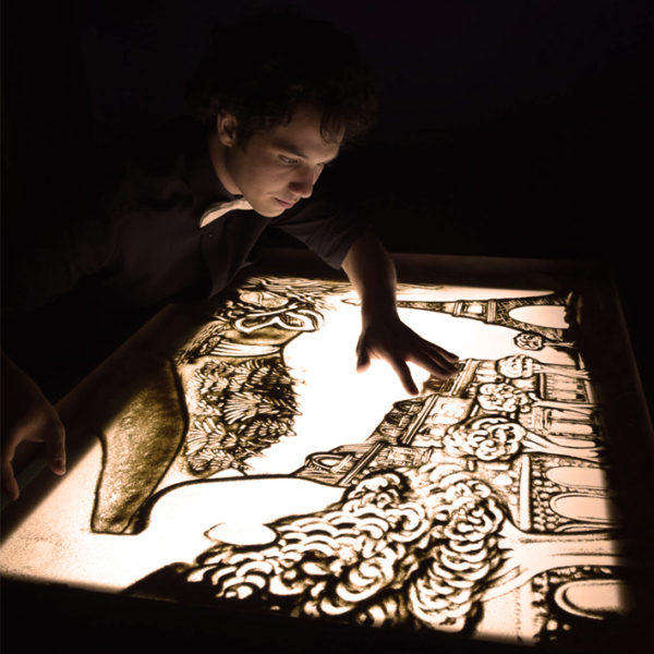 Narrazione con i fantastici disegni di sabbia e luci a ritmo di musica.