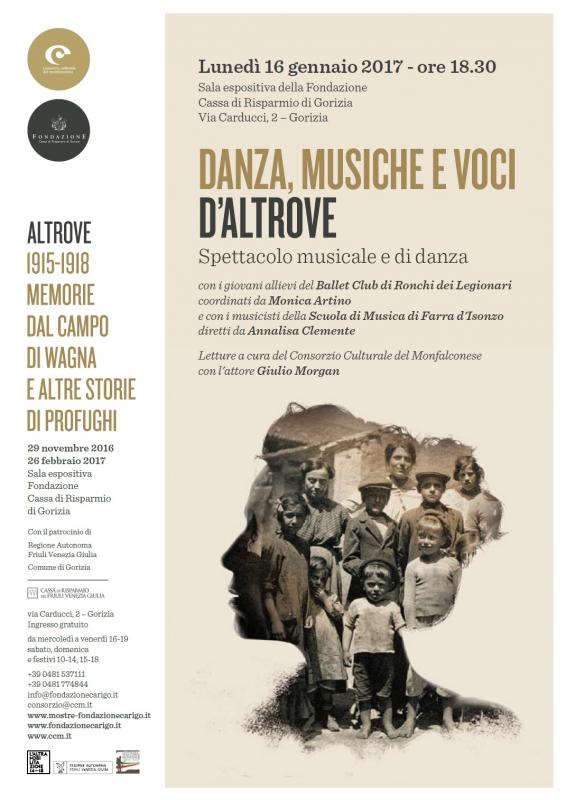 “Danza, musiche e voci d’Altrove” è il titolo dello spettacolo che lunedì 16 gennaio, alle 18.30, darà il via, nella sala espositiva della Fondazione Carigo (via Carducci 2 - Gorizia), al programma di eventi collaterali alla mostra “Altrove (1915-1918). Memorie dal campo di Wagna e altre storie di profughi”.