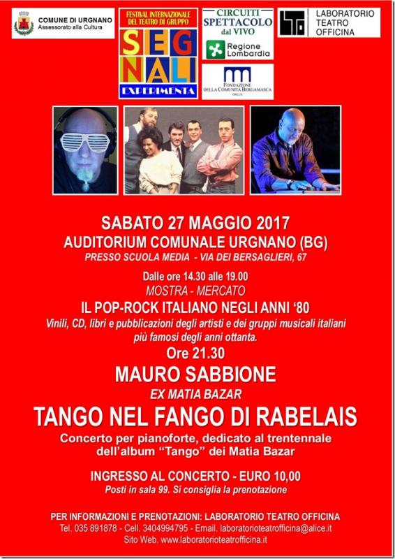 Un periodo progettuale clamoroso, attraverso tre dischi, quello che Mauro Sabbione ha compiuto da protagonista in un uno dei gruppi storici della musica italiana, con brani famosi e conosciuti arrangiati con una tecnica straordinaria, con immagini esclusive e aneddoti originali. “Tango”, viene riproposto come una sonata di Chopin, senza i suoi elettronici arrangiamenti e senza canto, come nove quadri d’autore con le variazioni agogiche, dove coesistono l’andante moderato “I bambini di poi” il largo “Scacco un po’ matto” l’allegro “Elettrochoc” il prestissimo “ll video sono io” la valse “Il treno blu”, ma anche il maestoso “Vacanze romane” suonati in sincrono con l’accompagnamento di un video dove scorrono immagini e filmati inediti, ritrovate e restaurate ed aneddoti meravigliosi sull’epopea elettronica dei Matia Bazar del quale Mauro Sabbione è stato indiscusso protagonista, sia come compositore che musicista.