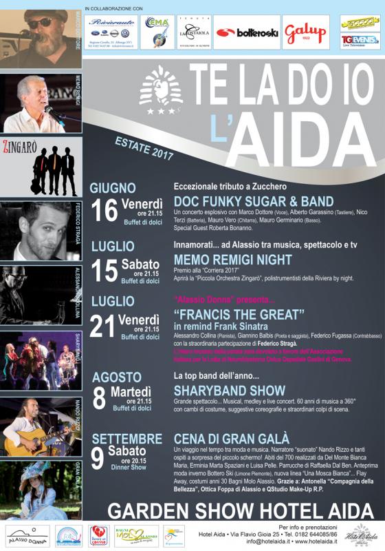 Torna la rassegna estiva d'arte varia nel suggestivo Garden Show dell'Hotel Aida di Alassio. “Te la do io l'Aida” estate 2017 quest'anno si fa in cinque! Novità di questa edizione, quattro spettacoli a partire dalle ore 21.15, dopo cena (16 giugno -15 luglio – 21 luglio – 8 agosto) con anteprima “buffet di dolci” e l'ultimo il Gran Galà di sabato 9 settembre con una gustosa cena inizio ore 20.15. Dichiarano la responsabile Ieria Francesca e i figli Giovanni e Angelo Galtieri contitolari della struttura: “ancora una volta speriamo di accontentare tutti e di poter offrire una rassegna di buona qualità nel rispetto del programma cittadino e come valida alternativa alle tante proposte che propone il territorio. Ringraziamo tutte le aziende che collaborano con noi e il fantastico staff dell'Hotel Aida che ci segue con passione in questa pazza ma bella avventura. Permettetemi di ricordarvi la serata di venerdì 21 luglio che organizza l'Associazione Alassio Donna dove sarà devoluto il ricavato all'Associazione Italiana lotta al Neuroblastoma Gaslini di Genova. Grazie a tutti e mi raccomando vi aspettiamo numerosi”.