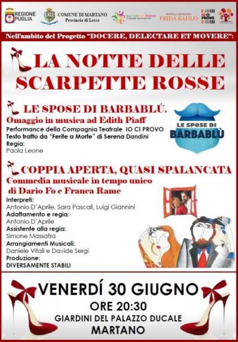 Nell'ambito del Progetto del Comune di Martano "Docere, delectare et movere", finanziato dalla Regione Puglia, venerdì 30 giugno 2017 alle ore 20.30 nella splendida cornice dei Giardini del Palazzo Ducale si terrà "La Notte delle Scarpette Rosse", con il seguente programma: