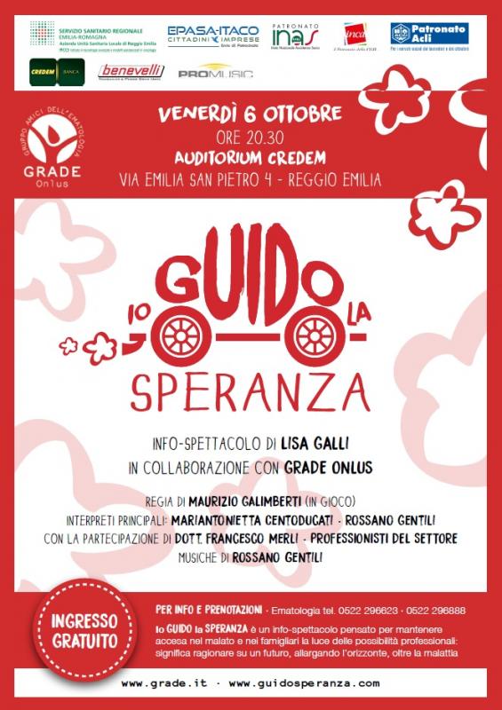 Alle ore 20.30 verrà rappresentato “io GUIDO la SPERANZA” , un info-spettacolo ideato dalla psicologa-psicoterapeuta Lisa Galli , che per l’occasione ha collaborato con la Fondazione GRADE Onlus di Reggio Emilia. La regia sarà curata da Maurizio Galimberti (In Gioco), mentre Rossano Gentili si occuperà delle musiche. Lo stesso Gentili e Mariantonietta Centoducati saranno gli interpreti principali, ma la rappresentazione vedrà anche la partecipazione del Dott. Francesco Merli , Direttore della Struttura Complessa di Ematologia dell’Arcispedale Santa Maria Nuova - IRCCS Cancer Center di Reggio Emilia, e di altri professionisti del settore.