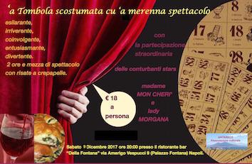 NATALE è alle porte, si avvicina il periodo più bello dell’anno e con esso la magica e caratteristica atmosfera che lo contraddistingue alla riscoperta, di quegli antichi e tradizionali valori tipici delle festività natalizie. Quale miglior modo quindi per dare il benvenuto all’ultimo mese dell’anno nel pieno contesto della tradizione natalizia partenopea se non con la caratteristica tombolata? Gioco tipico ed emblema secolare dei giorni più belli dell’anno, miscuglio di culto, rito, tradizione e perché no anche un pizzico di superstizione. Ebbene, anche noi vogliamo dare il nostro benvenuto alle festività ormai imminenti con la caratteristica Tombola Scostumata cu ‘a Merenna Spettacolo.