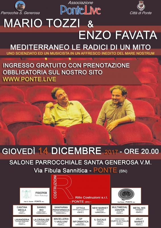 L’Associazione Ponte.Live vi invita giovedì 14 Dicembre p.v., alle ore 20:00, c/o il Salone Parrocchiale Santa Generosa V.M., in via Fibula Sannitica di Ponte (BN), allo spettacolo “MEDITERRANEO, LE RADICI DI UN MITO”. Uno scienziato della terra e un musicista che della musica della sua terra ha fatto una inconfondibile cifra stilistica. Mario Tozzi, il geologo noto al grande pubblico per le sue trasmissioni televisive, e Enzo Favata, sassofonista jazz apprezzato sulla scena internazionale, insieme raccontano il mare nostrum attraverso il particolare punto di vista della geologia, scienza tanto affascinante quanto trascurata, e la musica al confine tra passato e futuro. Da questo incontro scaturisce un affresco inedito del Mediterraneo, un film senza immagini raccontato con le parole e i suoni, nel quale prendono forma paesaggi arcaici, miti dimenticati e ricerca scientifica, rivelando allo spettatore una geografia antica, sepolta nella stratificazione delle ere geologiche e preistoriche. Visto i posti limitati, è obbligatorio la prenotazione sul nostro sito www.ponte.live, ingresso gratuito. L’Associazione Ponte.Live ringrazia il parroco di Ponte, don Alfonso Calvano, ed i seguenti TopSponsor di Ponte per la preziosa collaborazione: RILLO COSTRUZIONI S.R.L. FISIOTER VINI
