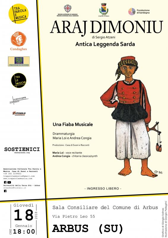 Giovedì 18 Gennaio alle ore 18:00 presso la Sala Consiliare del Comune di Arbus (Via Pietro Leo 55), la Casa di Suoni e Racconti, in collaborazione con l’Università della Terza Età e con il Comune di Arbus, porterà in scena Araj Dimoniu di Sergio Atzeni, sotto forma di Fiaba Musicale. Scritta nel 1984, sarà interpretata dall’attrice Maria Loi e dal chitarrista Andrea Congia. Un viaggio, quasi un sogno, in cui Luisu, accompagnato dal cavallo Araj, incontra uomini e donne singolari, animali parlanti e misteriosi, un lungo cammino «per vedere come vivono gli uomini». Vicende fantastiche attendono i due compagni di avventura, che scopriranno un Mondo pervaso dall’avarizia e dalla brama del potere, ma abitato anche da persone buone. Lo Spettacolo è inserito all’interno della rassegna letteraria “Autori e Lettori” organizzata dall’Università della Terza Età di Arbus ed è una delle tappe della Rassegna di Spettacolo Significante 2018 - FRORIS, ideata da Andrea Congia e organizzata dall’Associazione Culturale Tra Parola e Musica, che gode del Patrocinio della Regione Autonoma della Sardegna, del Comune di Arbus e della Fondazione di Sardegna. Significante è il primo segmento del progetto artistico-culturale della Casa di Suoni e Racconti che prende il nome di TRA LE MUSICHE, con cui l’Associazione indaga l’agire performativo della Musica. A sostegno del Progetto è stata attivata una campagna di crowdfunding sulla piattaforma buonacausa.org (buonacausa.org/cause/tra-le-musiche-2018). L’ingresso allo spettacolo è libero.