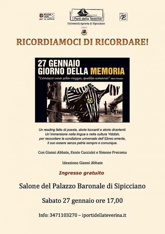Sabato 27 gennaio ore 17,00, presso il Salone del Palazzo Baronale di Sipicciano, il Teatro Null Officina culturale della Regione Lazio I porti della Teverina, con il Patrocinio dell’Università Agraria e della Pro Loco di Sipicciano, per la Giornata della Memoria presenta “Ricordiamoci di ricordare”, ideazione Gianni Abbate. Uno spettacolo fatto di narrazione, poesia, storie toccanti e storie divertenti. Un`immersione nella lingua e nella cultura Yiddish, per raccontare la condizione universale dell`Ebreo errante, il suo essere senza patria sempre e comunque. La leggerezza delle battute più sottili in contrasto con i racconti dei lager e dei soprusi. Un puzzle Yiddish coinvolgente, colorato, al quale partecipano tutti i personaggi-tipo: ebrei polacchi, americani, russi e tedeschi, commercianti, sarti e rabbini, tornando così sui passi di «quel popolo eletto» cacciato e sparso per il globo, eppure unito dalla propria mastodontica cultura. Lo spettacolo inizia, senza troppi preamboli, con un sorriso. Un sorriso antico ed esperto, di chi fin dall’alba dei tempi ha dovuto sfruttare l’ironia per far fronte alle proprie disgrazie e ha saputo riciclare aneddoti e storielle per forgiare una sagace oratoria in risposta al razzismo e alle calunnie. Lo spettacolo ci avverte anche che la lotta contro il fascismo, il razzismo e le ideologie, che sono state alla base delle deportazioni e dell’olocausto, purtroppo non sono state ancora sradicate del tutto in Italia e nel mondo, ed è come se ci dicesse: fate attenzione, non abbassate la guardia. Discriminazione razziale, fanatismo politico e religioso, violenza e arbitrio, guerra, fame, sottosviluppo, sfruttamenti e malattie, mietono ancora vittime in tutto il mondo. Ricordare, dunque, per capire i pericoli e riconoscere le ingiustizie, per combatterle insieme, in un grande movimento che unisca tutti gli uomini in un vincolo di solidarietà verso mete di pace, di uguaglianza, di libertà e di giustizia.