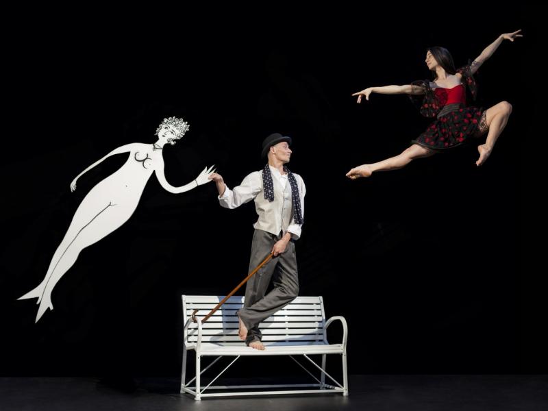 La regia, come ai tempi del cinema primitivo, sembra azionare manualmente la pellicola, accelerando o rallentando l’esecuzione degli interpreti. Potenti atleti e aggraziati ballerini si materializzano in scena, interagendo con disegni animati, pupazzi, animali o oggetti. Ritagliati dal buio come silhouettes, nuotano in coloratissimi fondali marini, volano al chiar di luna sui tetti di Parigi, litigano col loro doppio animato, recuperano oggetti piovuti dal cielo…
