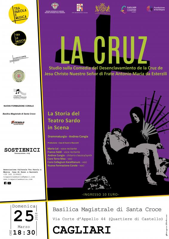 Si terrà nella suggestiva Basilica Magistrale di Santa Croce a Cagliari, nel quartiere storico di Castello (Via Corte d’Appello 44), il quinto appuntamento cagliaritano della Rassegna di Spettacolo Significante 2018 - FRORIS, Domenica 25 Marzo 2018 alle ore 18:30 con La Cruz, progetto musico teatrale che trae spunto da la Comedia del Desenclavamiento de la Cruz de Jesu Christo Nuestro Señor di Frate Antonio Maria da Esterzili. La Comedia da cui trae origine lo Spettacolo, scritta oltre 300 anni fa, è la prima testimonianza teatrale e drammaturgica della Lingua Sarda nella variante Campidanese e rappresenta un importante documento della storia del Teatro Sardo.