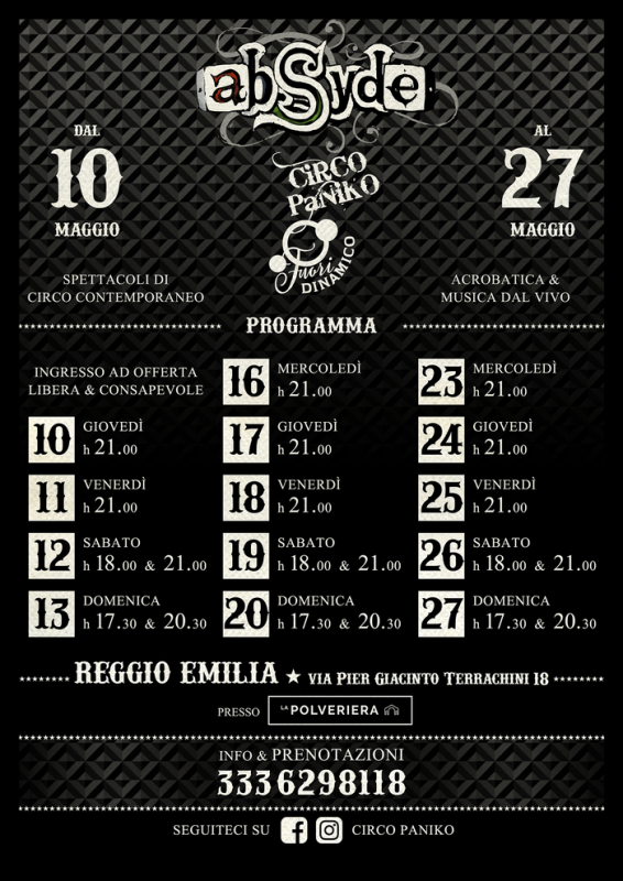 Arriva a Reggio Emilia, dall'11 al 27 maggio 2018 presso La Polveriera, l'ultimo spettacolo del Circo Paniko, ABSYDE. Gli spettacoli rientrano nella programmazione del FuoriDinamico, in collaborazione con il Dinamico Festival di Reggio Emilia. ABSYDE, l’ultima creazione del Circo Paniko, è uno spettacolo che esplora il grande immaginario del gioco di società: pedine, votazioni, meccanismi e tabelloni, personaggi surreali e dinamiche in costante divenire accompagnano il pubblico all’interno di un mondo folle, narrato attraverso numeri di acrobatica, musica e teatro, per varcare la soglia di un mondo fantastico e poter vivere un’atmosfera fuori del tempo e dallo spazio. Lo spettacolo è consigliato per ogni tipo di pubblico, dai 3 ai 99 anni.