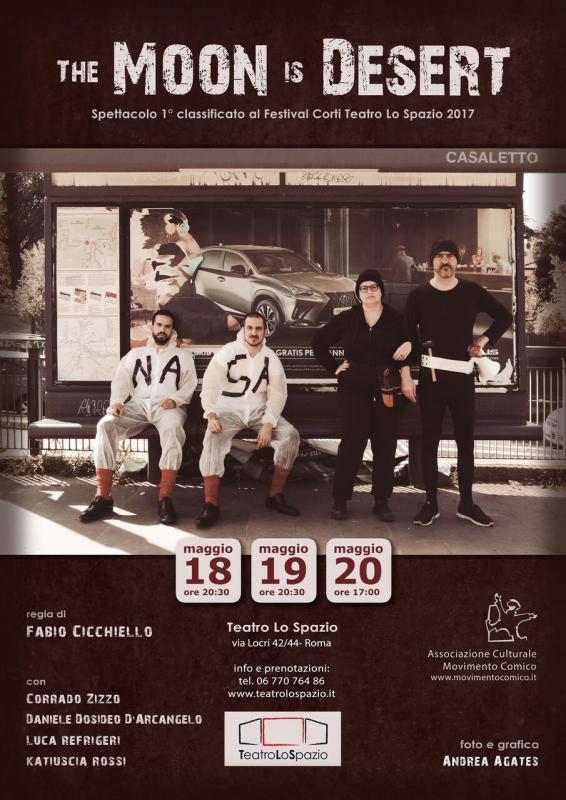 I quattro attori condurranno in pubblico nello spazio. Protagonisti due clown diversi da come siamo abituati a vederli: i nostri usano poco la parola e non indossano il naso rosso. Hanno lavorato con passione e studiato anni per diventare clown e sulla scena la loro arte si ispira a quella di Charlie Chaplin e Buster Keaton. The moon is desert è l’occasione di una vita per realizzare i loro tre sogni: esibirsi in un teatro, passeggiare nello spazio e dimostrare che davvero sulla luna non c’è alcuna forma di vita.