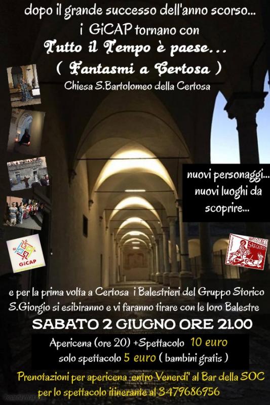 Sabato 2 Giugno alle ore 21, con partenza dal Teatro Soc Certosa (Via San Bartolomeo della Certosa 11, Genova), la Compagnia GiCAP propone lo spettacolo itinerante in costume Tutto il Tempo è paese... (Fantasmi a Certosa), nell'antico Chiostro e in altri luoghi misteriosi. Uno spettacolo alla riscoperta di antiche storie e leggende e quest'anno impreziosito dall'esibizione dei Balestrieri del Gruppo Storico San Giorgio, che faranno inoltre scoprire l'uso delle balestre a grandi e piccini.