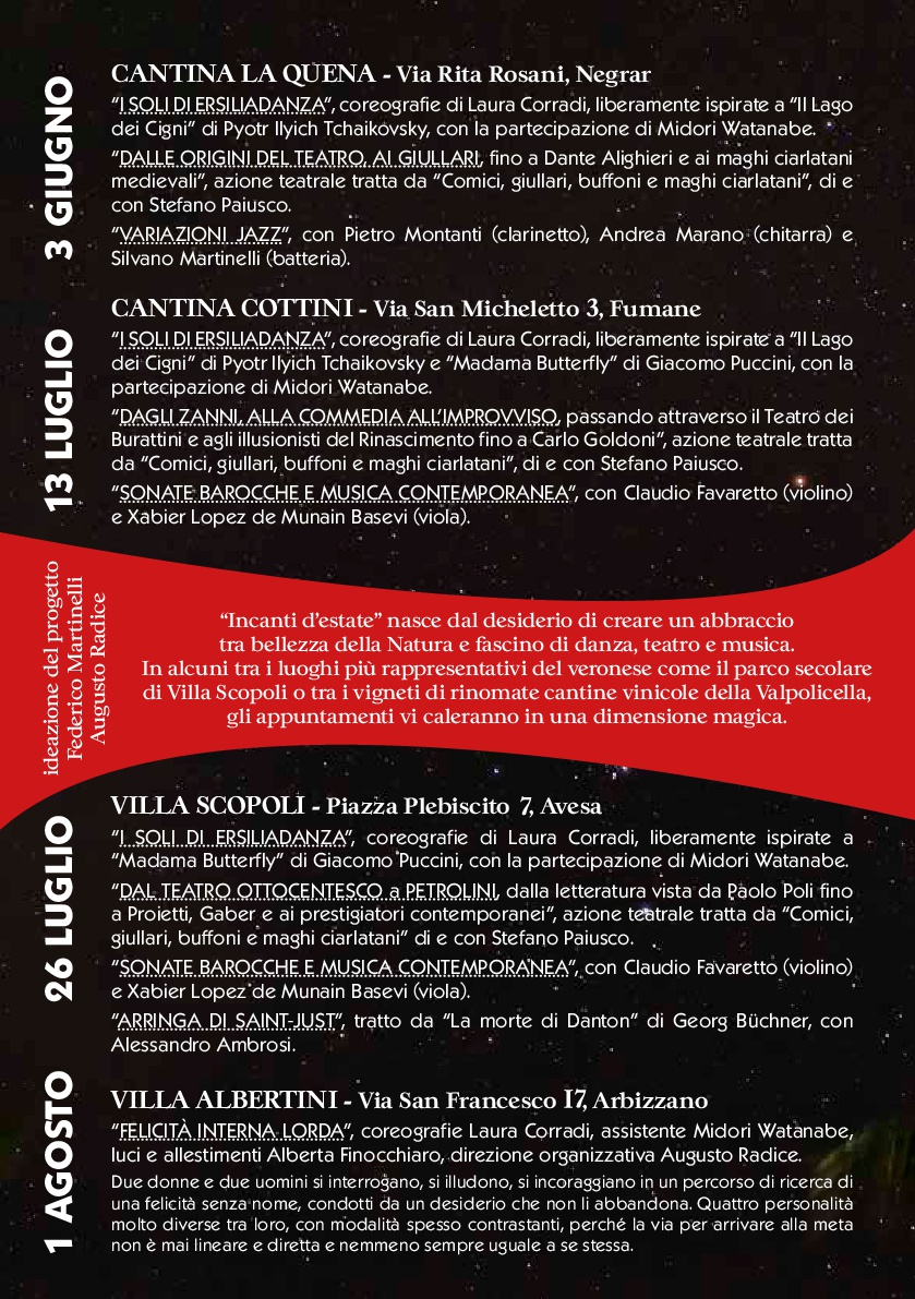 "Incanti d'estate" nasce dal desiderio di creare un legame ancora più forte tra la magia ed il fascino delle arti performative: il teatro, la musica e la danza, e la bellezza e le suggestioni di alcune tra le più incantevoli location del veronese.