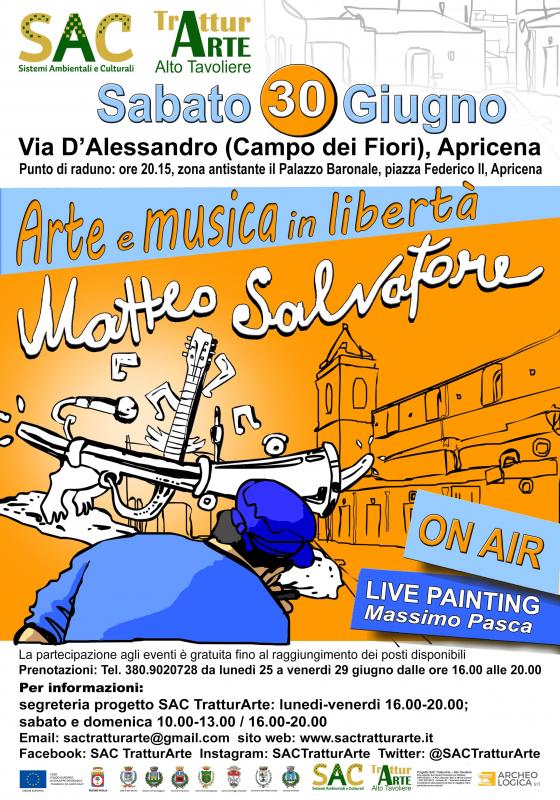 Sabato 30 giugno, dalle ore 20.15 alle 22.30 circa, in via Vincenzo D’Alessandro (Campo dei Fiori) ad Apricena, si svolgerà l’appuntamento “ON AIR Arte e musica in libertà – Matteo Salvatore”. L’evento è il primo previsto dal progetto SAC TratturArte – Alto Tavoliere rientrante nella tipologia “On Air”, un’innovativa forma di valorizzazione dei luoghi d’arte dell’Alto Tavoliere che si propone di portare la street art in luoghi caratteristici e insoliti, attraverso l’esibizione dal vivo in varie forme (graffiti, live painting, proiezioni, ecc.) di artisti contemporanei, con l’accompagnamento ritmato di luci e suoni.