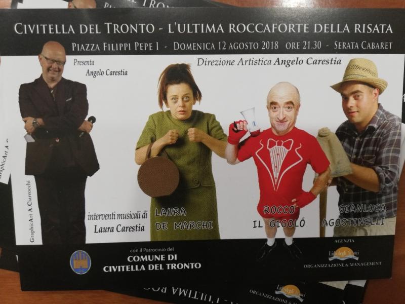 CIVITELLA DEL TRONTO – Una serata tutta da ridere il 12 agosto a Civitella del Tronto con la sesta edizione della Rassegna “L’ultima Roccaforte della Risata”, organizzata dal Comune di Civitella del Tronto con la direzione artistica di Angelo Carestia e dell’Agenzia “Lido degli Aranci” di Grottammare. La kermesse comica andrà in scena questa domenica dalle ore 21 in piazza Filippi Pepe, stupenda cornice di epici scontri a suon di gag ed esilaranti battute. Infatti, ad alternarsi sul prestigioso palco civitellese, ci sarà un nutrito parterre di star della risata note al grande pubblico. Si parte con le gag di Rocco “il Gigolò” Ciarmoli, uno dei fondatori del trio comico “Le Tutine” del cast di Zelig Circus, con all’attivo partecipazioni a Zelig in prima serata e a tantissimi programmi televisivi (“Striscia la notizia”, “La fabbrica del sorriso”, “Guarda che luna”, “Matinee”, “ X Generation”, “I Caruso”, la rassegna “Faccia da comico” diretta da Serena Dandini) e autore del “Kamasutra secondo Rocco”.
