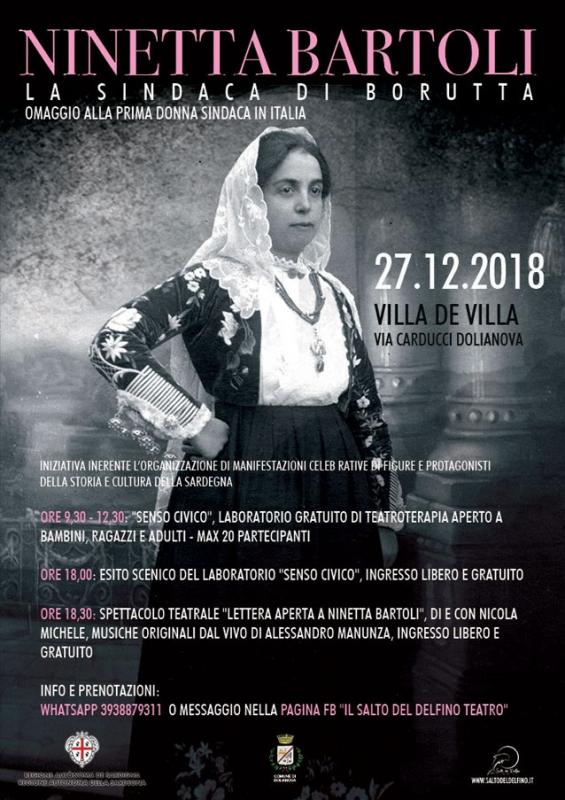 Saranno gli spazi di Villa de Villa ad ospitare lo spettacolo "Lettera aperta a Ninetta Bartoli", il nuovo monologo messo in scena dalla Compagnia Salto del Delfino, in scena giovedì 27 dicembre alle 18.30 (ingresso libero) a Dolianova. Il lavoro è dedicato a Ninetta Baroli, la prima donna italiana ad aver rivestito (per ben dodici anni) la carica di sindaco nel piccolo paese di Borutta (a trenta chilometri da Sassari) a partire dal 1946, ed è ideato e messo in scena da Nicola Michele, con le musiche di Alessandro Manunza.