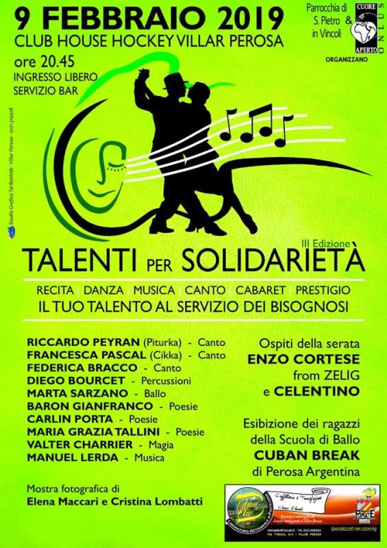 Il gruppo missionario Cuore Aperto Onlus di Villar Perosa organizza una serata di beneficenza sabato 9 febbraio alle 21 presso i locali dell’Hockey Club in via Dante Alighieri “Talenti per solidarietà – Danza, musica, canto, cabaret, prestigio, il tuo talento al servizio dei bisognosi”. “Per il terzo anno consecutivo riproponiamo una serata di varietà un po’ diversa dal solito - racconta la vice Presidente Silvana Rolando – dove ad esibirsi saranno cantanti, ballerini, musicisti, illusionisti. Per così dire gente comune ma dai grandi talenti, con la voglia di mettersi in gioco e di esibirsi per uno scopo solidale. Quest’anno abbiamo inserito delle belle novità”. Una Villar Perosa ( e non solo!) che si riunisce, che si esibisce, per divertirsi e per far divertire. Parteciperanno i cantanti: Riccardo Peyran (Piturka), Cikka, Federica Bracco, l’illusionista Mago Valter Charrier, i poeti Carlin Porta, Maria Grazia Tallini e Baron Gianfranco, la ballerina Marta, Manuel Lerda, artista di musica tradizionale occitana con la ghironda, l’organetto e la cornamusa. Vi sarà l’esibizione dei ballerini della scuola di ballo Cuban Break di Perosa Argentina, che spazieranno in diverse tipologie di ballo: dall’hip hop al latino americano capitanati dal maestro Alessio Heritier e quest’anno gli ospiti d’eccezione saranno due: il cabarettista Enzo Cortese, autore dei testi di Gabriele Cirilli (Tatiana…chi è Tatiana??) di Zelig e autore televisivo. Un cabaret che non manca di stuzzicare l’intelligenza di chi l’ascolta. Monologhista pungente, fine conoscitore delle “paranoie” quotidiane viste dal punto di vista sia maschile che femminile. Una comicità senza eguali che farà divertire il pubblico presente. Altro prezioso ospite il carissimo amico Celentino che non ha bisogno di molte presentazioni! Con la sua musica ci farà rivivere le canzoni di Adriano Celentano, dinamico personaggio, coinvolgerà il pubblico in modo travolgente animando allegramente la serata. Inoltre sarà allestita una mostra fotografica di Elena Maccari e Cristina Lombatti. L’Ingresso è ad offerta libera e le eventuali donazioni saranno destinate all’associazione Cuore Aperto per la compera ed invio di un container di aiuti umanitari in Africa (Mali).