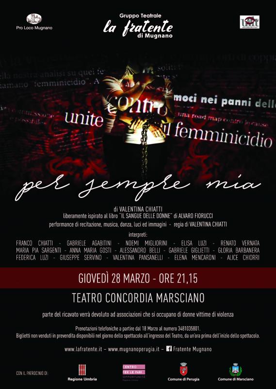 A due anni dal debutto PER SEMPRE MIA di Valentina Chiatti, liberamente ispirato al libro IL SANGUE DELLE DONNE di Alvaro Fiorucci e portato in scena dal Gruppo teatrale LA FRATENTE di Mugnano, continua la sua lotta alla violenza sulle donne.