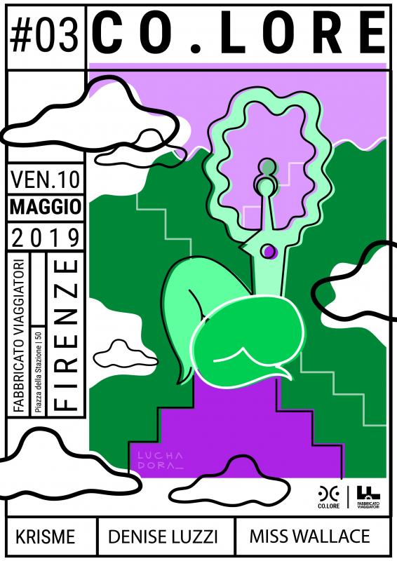 Torna a Fabbricato Viaggiatori per il numero #03, il progetto realizzato unicamente da donne: CO.LORE. Al terzo appuntamento, 10 Maggio 2019, tocca le tonalità dell’elettronica, dell’allestimento creativo e della grafica. Ospiti della serata 3 donne molto diverse, per età, vita ed esperienze, ma accomunate dall’amore per la consolle e dal fatto di essere donne. Krisme aka Cristina Tinacci, Denise Luzzi, giovanissima dj e resident del tube del Tenax dai 16, e Miss Wallace, ospite a Firenze dalla provincia di Verona. Location: Fabbricato Viaggiatori e il suo salotto sul binario, dalle 20.30 ingresso libero.
