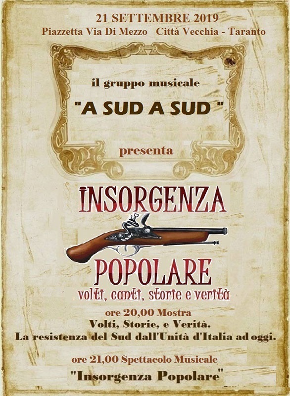 Insorgenza Popolare! sarà un viaggio, dalla fine del XIX secolo fino ai giorni nostri, all'insegna della riscoperta dei volti, dei canti, delle storie e, soprattutto, delle verità sull’insorgenza del sud contro l’unità d’Italia e, via via, contro lo sfruttamento delle nostre terre.