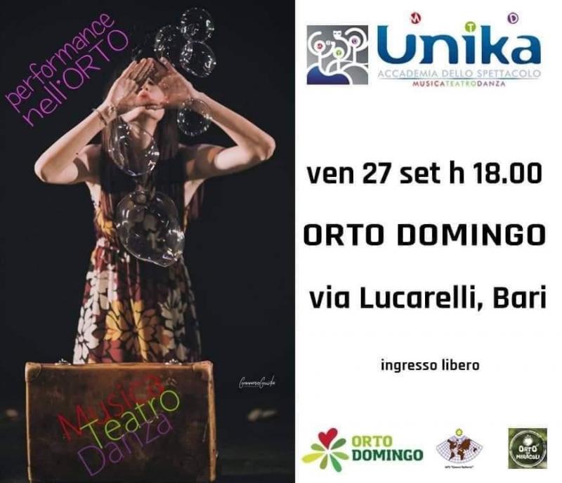 In linea con l’obiettivo di sperimentare una nuova formula di aggregazione sociale come quella di Orto Domingo, esempio di orto urbano di vicinato a cui hanno dato vita i residenti di Parco Domingo, in via Lucarelli, nel quartiere Poggiofranco a Bari, Unika, Accademia dello spettacolo di Bari, terrà venerdì 27 settembre alle 18.00 una performance nell’orto aperta a tutti tra musica, danza e teatro.