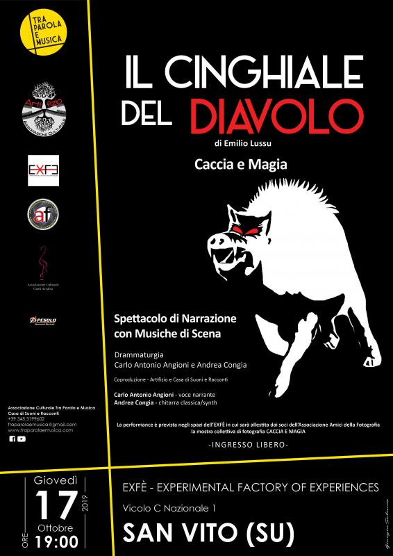 Il racconto Il Cinghiale del Diavolo di Emilio Lussu si presenta come performance di narrazione con musiche di scena. Lo spettacolo, produzione artistica della compagnia teatrale Artifizio in collaborazione con la Casa di Suoni e Racconti, sarà proposto Giovedì 17 Ottobre 2019 alle ore 19:00 presso l’EXFE - EXPERIMENTAL FACTORY of EXPERIENCES di San Vito (Vicolo C Nazionale 1). Tra Parola e Musica, l’attore Carlo Antonio Angioni e il chitarrista Andrea Congia, in un’atmosfera sospesa tra passato e presente, condurranno il pubblico nel racconto fatto di antiche Memorie tramandate oralmente di generazione in generazione, che hanno guidato la penna di Emilio Lussu nella sua personale raffigurazione letteraria di una Sardegna arcaica e misteriosa. La performance si svolgerà nello spazio multifunzionale dell’EXFE all’interno del quale sarà allestita, proprio per l’occasione, la mostra collettiva dal titolo Caccia e Magia che vedrà l’esposizione degli scatti fotografici dei soci dell’Associazione Amici della Fotografia, dando così possibilità al pubblico di una nuova prospettiva, questa volta visiva, del fascino quasi magico della nostra Isola.