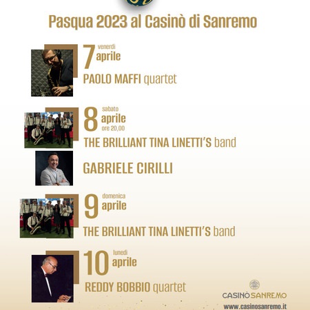 Gabriele Cirilli, The Brilliant Tina Linetti's, Reddy Bobbio Quartet, Paolo Maffi Quartet, Beatrice e Serena sono i prestigiosi artisti che si esibiranno sul Roof Garden del Casinò di Sanremo dal 7 al 10 aprile.