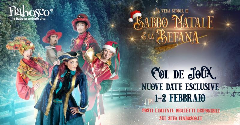 La Vera Storia di Babbo Natale e La Befana, uno spettacolo per famiglie ha debuttato il 21 dicembre con un "TUTTO ESAURITO" straordinario: spettacoli SOLD OUT già dalle prime ore della giornata, bambini e famiglie entusiasti del parco sulla neve di Col de Joux a Saint Vincent. L’ultimo appuntamento in occasione della Fiera di Sant’Orso, il primo week end di febbraio 2020. Per ogni giornata, più spettacoli: per tutte le info fiabosco.it