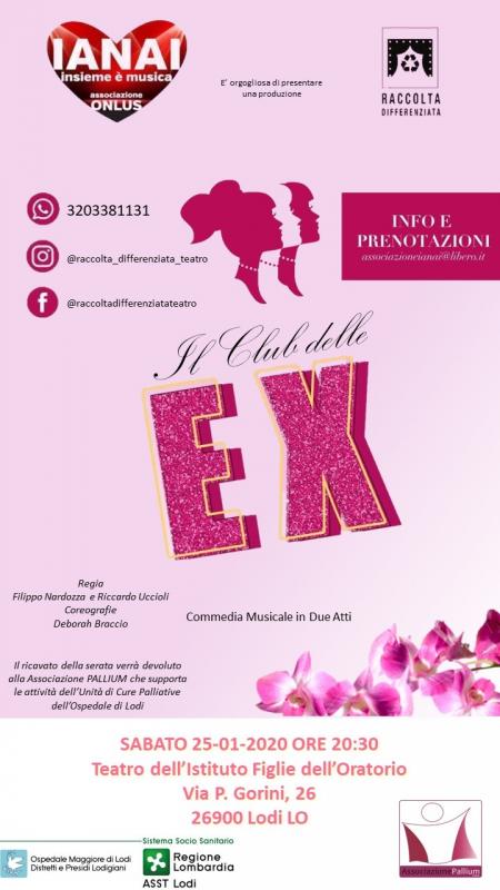 E’ in questa direzione che si sviluppa la trama de Il Club delle Ex, musical con cui il collettivo teatrale Raccolta Differenziata debutta sulle scene lodigiane sabato 25 gennaio 2020. Lo spettacolo in programma al Teatro Figlie dell’Oratorio di via P.Gorini,26 Lodi è un adattamento originale della storia resa celebre dal romanzo e dal film The First Wives Club - Il Club delle Prime Mogli (con Bette Midler, Diane Keaton e Goldie Hawn), che Raccolta Differenziata ha tradotto per il teatro musicale prendendo in prestito una selezione di brani dei più celebri musical di Broadway - da Hairspray a Chicago, da Legally Blonde a The Greatest Showman.
