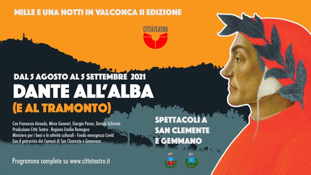 Dal 5 agosto al 5 settembre 2021 Città teatro presenta un ciclo di appuntamenti ad ingresso libero dedicati alla figura dantesca, che si svolgeranno all’alba e al tramonto nei comuni partner del progetto Mille e una notte in Valconca 2021: San Clemente e Gemmano (RN).