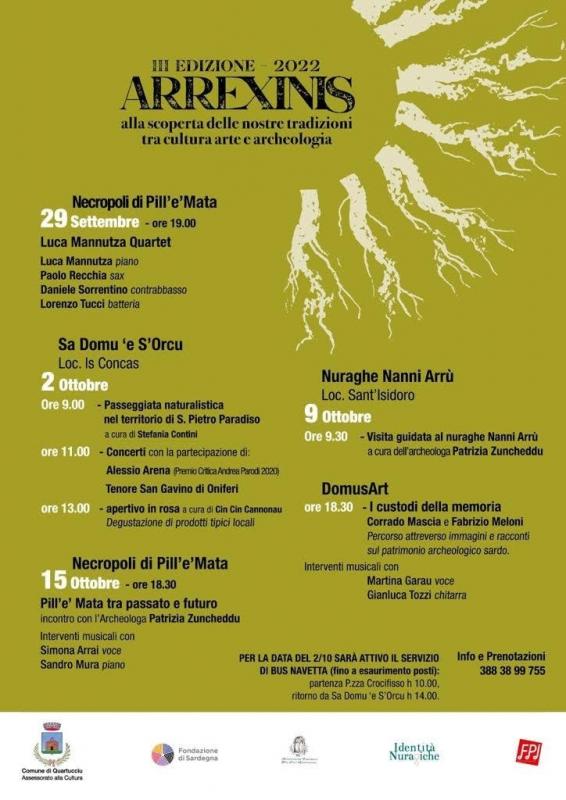 Primo appuntamento, giovedì 29 a Quartucciu, con Arrexinis, il programma di iniziative culturali e di spettacolo organizzato dal Comune (Assessorato alla Cultura) con l'apporto logistico della cooperativa Forma e Poesia nel Jazz e la collaborazione della Proloco nell'ambito di Quartucciu – La città madre: un insieme di manifestazioni che mira a valorizzare e far conoscere il patrimonio artistico, culturale e archeologico della cittadina dell'area metropolitana di Cagliari e del suo territorio.