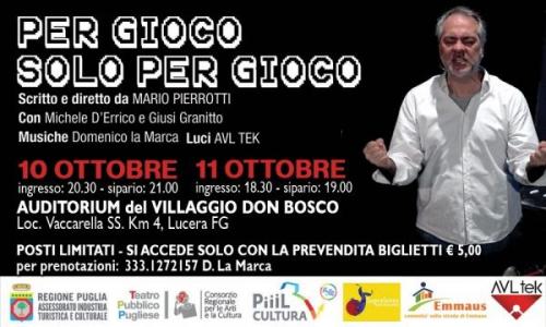 Sabato 10 alle 20.30 e domenica 11 ottobre alle 18.30 andrà in scena “Per gioco solo per gioco”, che affronta il tema della ludopatia.